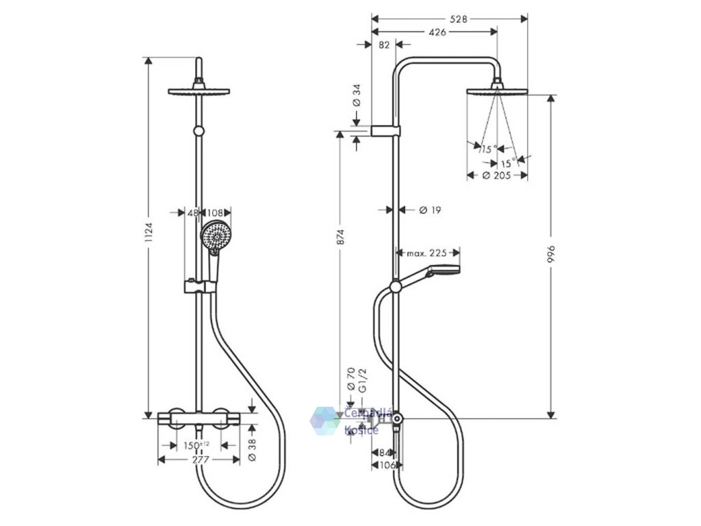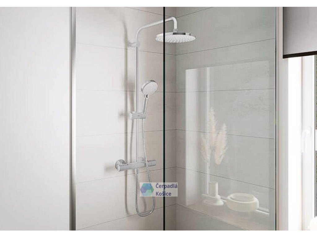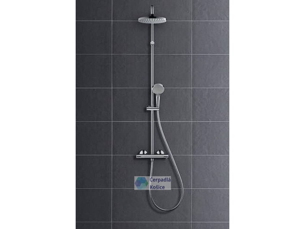 Sprchový set Hansgrohe s termostatickou batériou Vernis Blend 200 s celkovou výškou 1124 mm, s hlavovou sprchou Vernis Blend 200, s výškovo nastaviteľným jazdcom s aretáciou jazdca tlačidlom, s dĺžkou sprchového ramena hornej sprchy: 426 mm, s bezpečnostnou poistkou pri 40 °C
