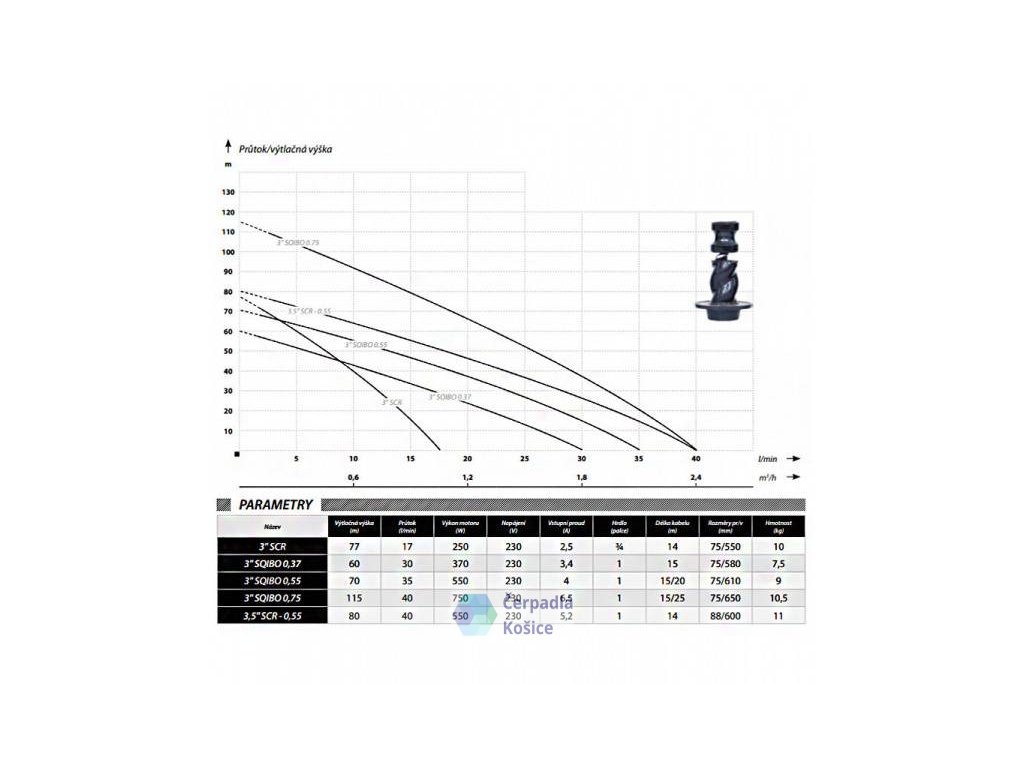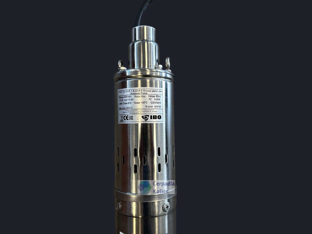 - Údaj hĺbka studne max udáva maximálnu hĺbku studne, vrtu v ktorej vám bude ponorné čerpadlo IBO 3,5 SCR - 0,50 pracovať s spínačom 2- 3,5Bar. Maximálny ponor pod hladinu vody u čerpadla IBO 3,5 SCR - 0,50 je 30m