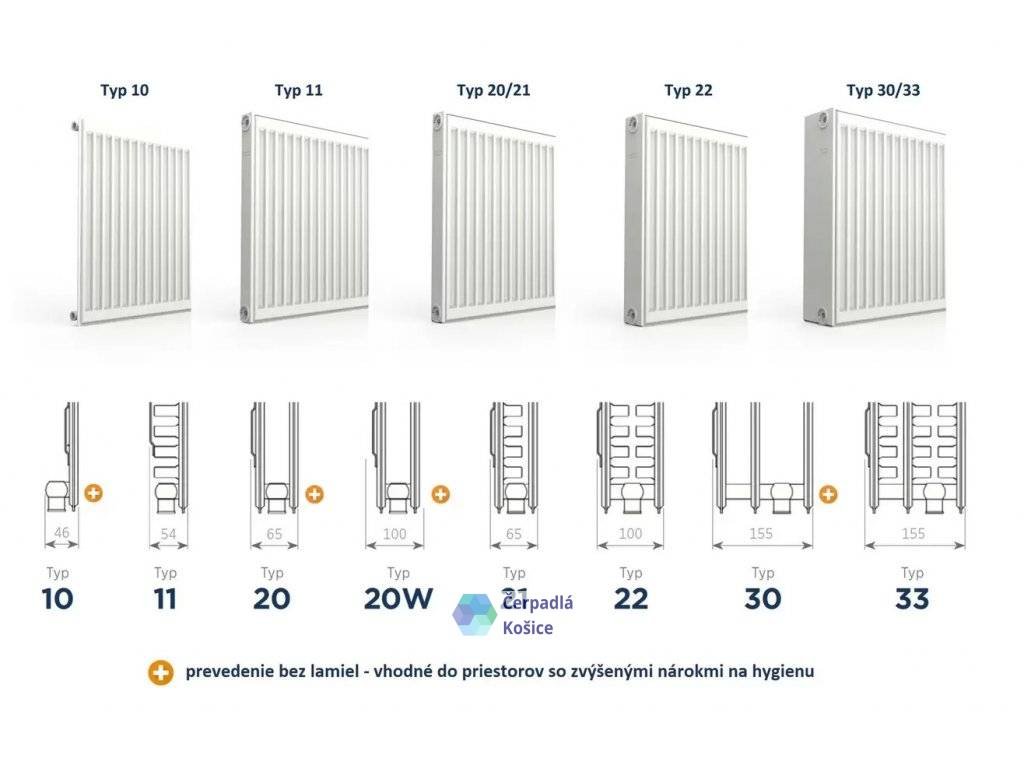 Jednotlivé typové rady radiátorov sú tvorené rozličným počtom panelov a konvektorov. Prvé číslo v označení typu znamená počet panelov, druhé číslo počet konvektorov. Jednotlivé typy sú vyrábané v stavebných výškach 300, 400, 500, 600 a 900 mm, typ určený pre rekonštrukcie vo výške 550 mm. Dĺžka sa mení od 400 mm do 3000 mm, môže byť však pre jednotlivé modely obmedzená. Povrchová úprava sa vykonáva kontinuálnym spôsobom na výrobnej linke. Štandardný farebný odtieň je RAL 9016.
