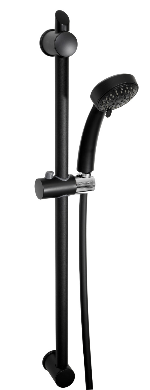 Sprchová súprava v prevedení čierna-mat pre sprchové batérie obsahuje 3-polohovú ručnú sprchu, posuvný držiak sprchy v dĺžke 740 mm a plastovú sprchovú hadicu s anti-twist systémom v dĺžke 150 cm. Priemer tyče 25 mm.Nastaviteľná rozteč montážnych otvorov až 660 mm.Dodatočné parametre